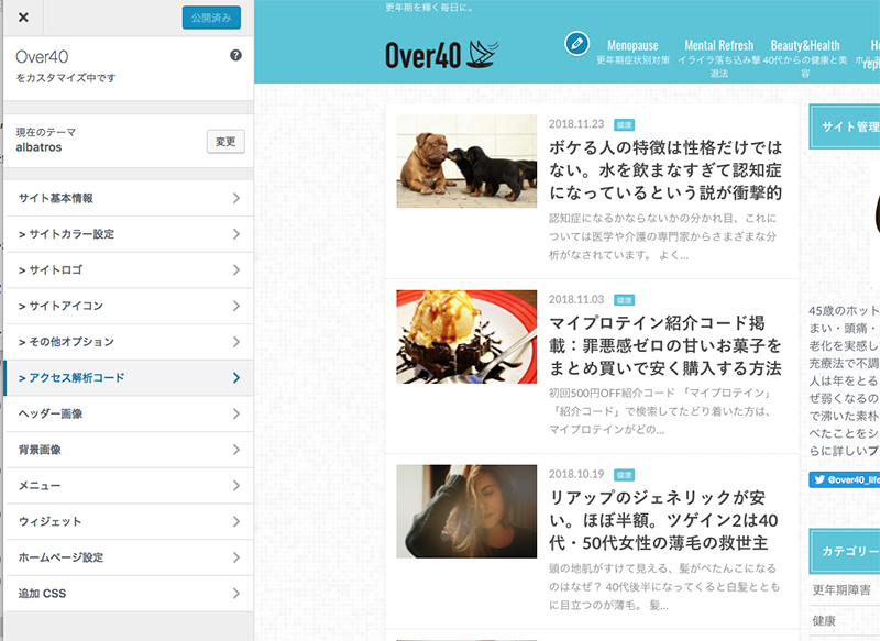アルバトロスのカスタマイズ画面、「アクセス解析コード」を選びます。