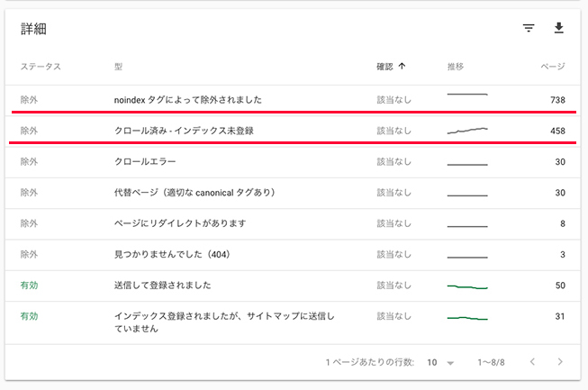 レポート下の「詳細」に、ステータス-型ー確認-推移-ページ とあり、そこになぜ除外されたかが記載されています。