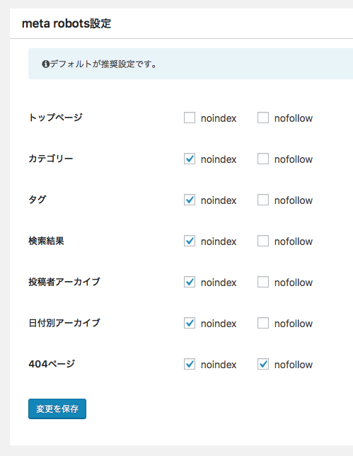 noindex・nofollow設定は、上級者になると考え方がいろいろあるようで、「カテゴリーやタグや日付のページがインデックスされるとサイト全体の質を低く認識されるから、という理由」からこのようにデフォルト設定しているとのこと。