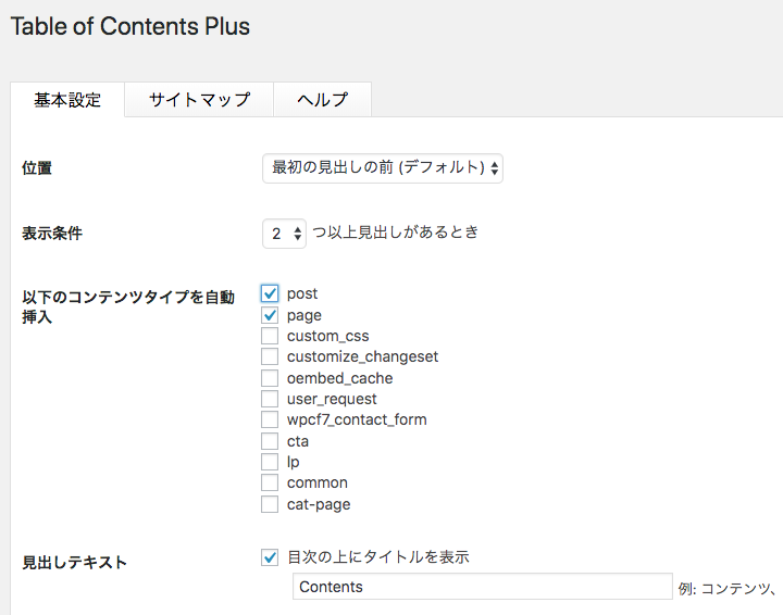 初期画面は「コンテンツタイプを自動挿入」のところは「page」のみにチェックが入っています。
