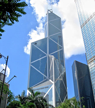 香港にある中国銀行タワーの形は、鋭角な角をもつ建築物です。