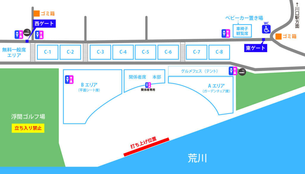 会場内と周辺の仮設トイレ・喫煙所・ゴミ捨て場はこちらをご覧ください。