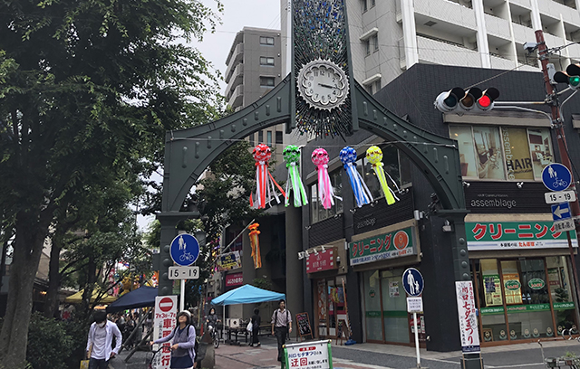 樹モールを通り抜けたところ。時計のゲートの向こう側が、七夕祭り会場の「ふじの市商店街」です。(八間通りを挟んで、商店街の名前が違います)
