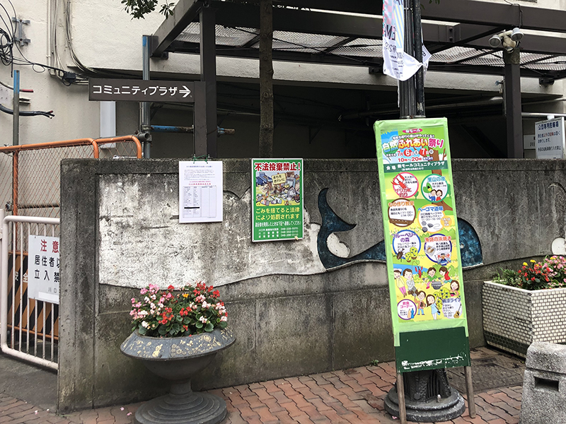 通り過ぎそうになるのですが、「コミュニティプラザ」の案内やじるしプレートと立て看板が目印。