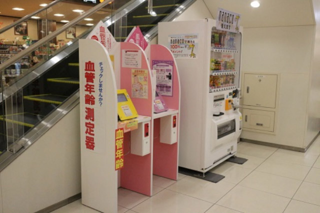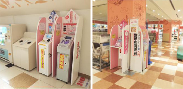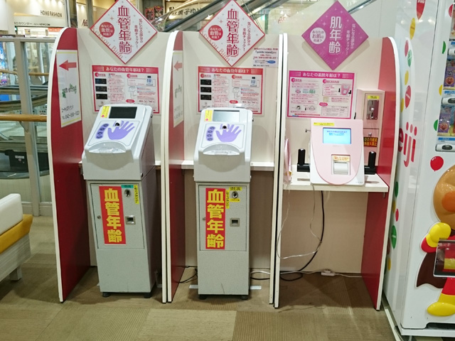血管年齢を測定できるコーナーや機械が設置されているショッピングモールやドラッグストアです。店舗によっては設置されていないこともあるので、詳細はお立ち寄りの店舗にてお確かめください。
