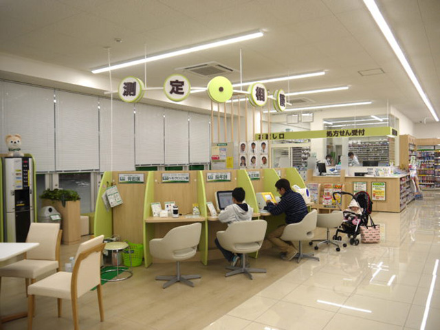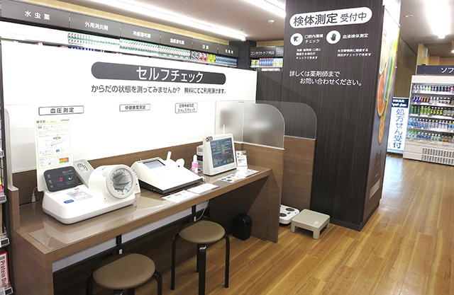 薬局コーナーのカウンターに機器が並ぶタイプ(無料)と、200円を入れてゲーム感覚で測定できる機械が設置されているタイプと2種類あるようです。
