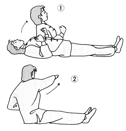 (1)仰向けに寝て、胸の両側でこぶしを握って構える。