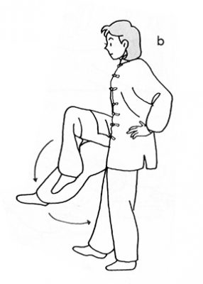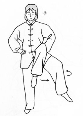 右手を上に伸ばし、頭を乗せる。左足を前後に振る。右足も同様に振る。