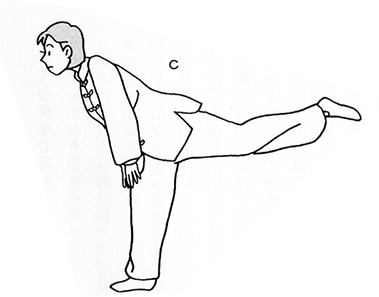 立って上半身をやや前に傾け、左足をできるだけ後ろに振り上げる。
