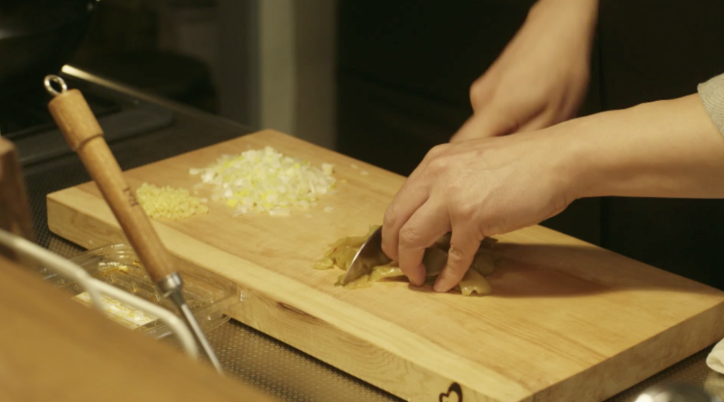 - 香りが出てきたらそこにたけのこの千切りを入れて炒める