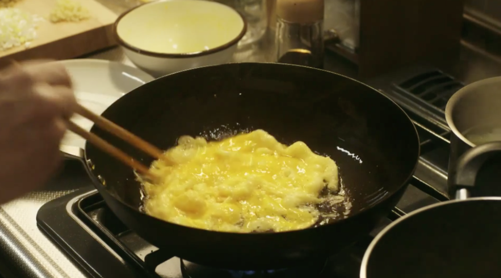 - たっぷりの熟した油で塩味のいり卵を作る