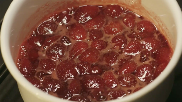 8. 煮詰めていくと一度抜けたいちごのエキスがもう一度いちごに戻ってきて粒が透明な深いルビー色になってくる