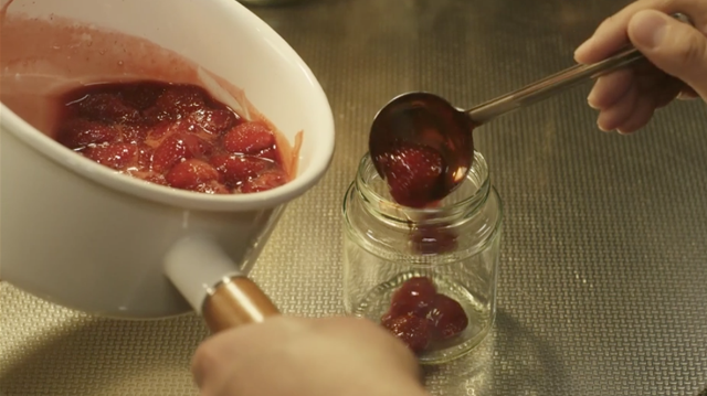 9. いちごの粒がすべてルビー色になってとろりと煮詰まったら火を止めてそのまま熱いうちにビンに詰めて蓋をする