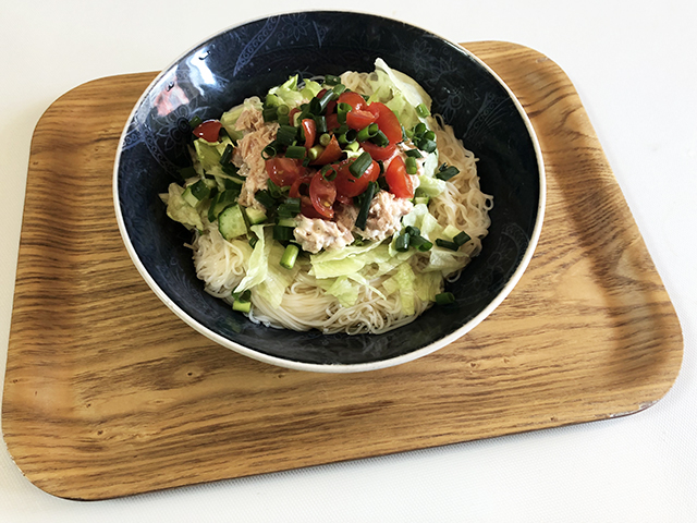 そうめんをゆでて水で洗ったあと、氷水でしめて水を切ってからすべての材料をぶっかけて食べます。