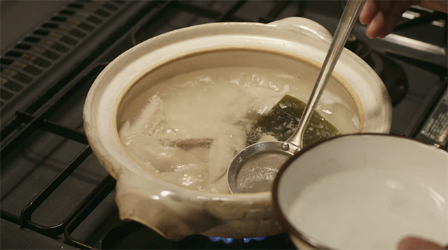 2. 土鍋に残ったダシにご飯を入れて弱火で煮ながら、控えめに塩で味付け。