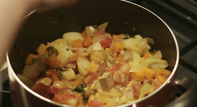 4. なべに切った野菜を全部いれる。ふたをしておくと水分が野菜からかなり出てくるので中弱火で。じゃがいもとキャベツは火が通りやすいのであとから。