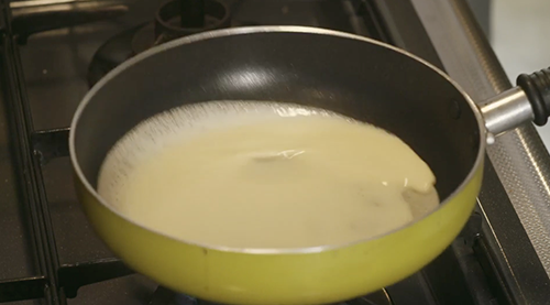 クレープの生地を小さめのおたまで8分目くらい入れて直径18cmのフライパンで焼く。