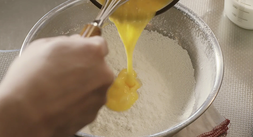 ボウルの中の粉の中央にくぼみを作る。卵2コを溶きほぐして粉のくぼみに流し、泡立て器で粉と卵を混ぜる。
