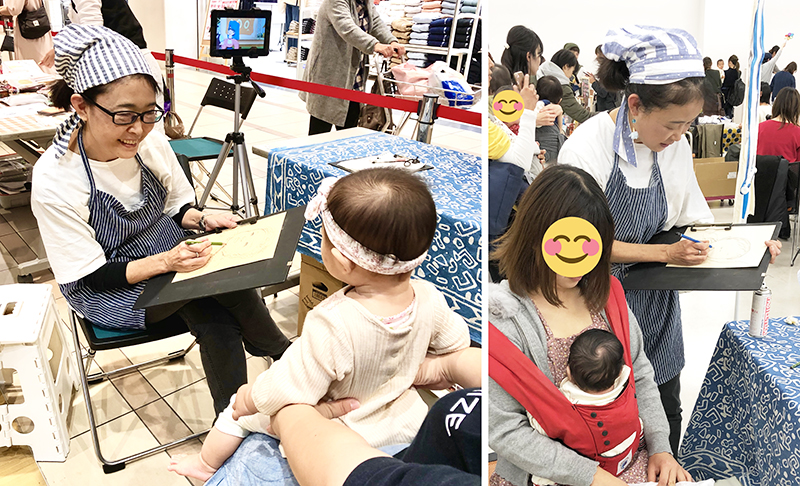 通常の対面スタイル。小さいお子さんの視線を釘付けにして急いで描きます!すやすやおねんね赤ちゃんはママだっこのままで。