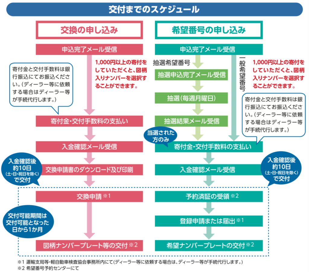 メールを受信したら、記載されている「交付可能期限」内に、指定の予約センターにて希望番号予約済証を受領後、運輸局に車を持ち込んで交換となります。