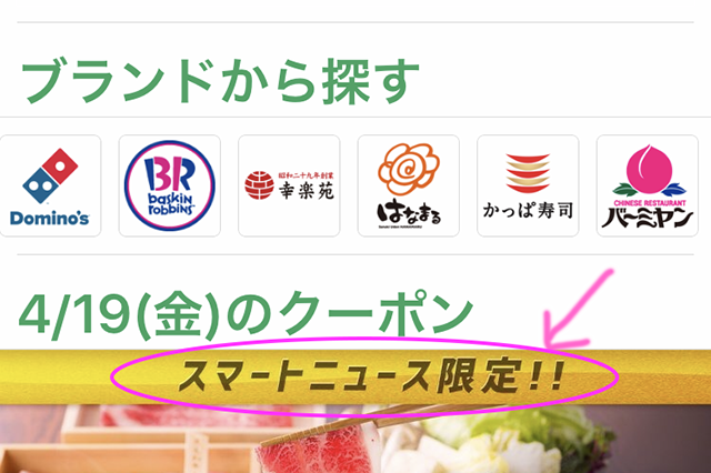 グノシーよりも高い割引率のクーポンは、たいてい「スマートニュース限定!」の最初の方に並んでいます。
