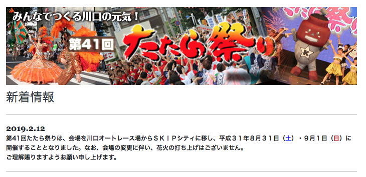 たたら祭り2019の会場は、今年はSKIPシティに変更となり、開催場所の都合で打ち上げ花火は実施しないとのことです。