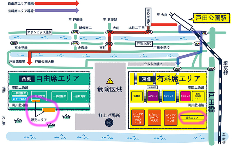 2019年の会場マップによると、有料席エリア拡大のため、駅から会場までの徒歩ルートは「有料席」「自由席」で区別するそうです。