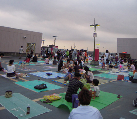この時間、屋上への車での入場はできません。入場は無料、場所取りOK。