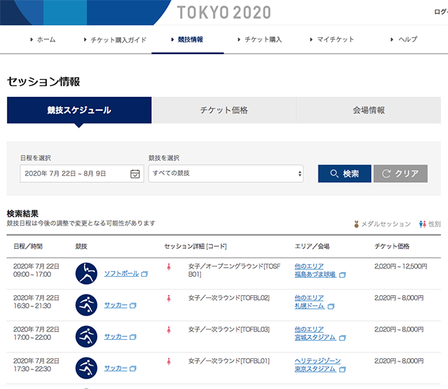 競技の日程・価格を確認すること