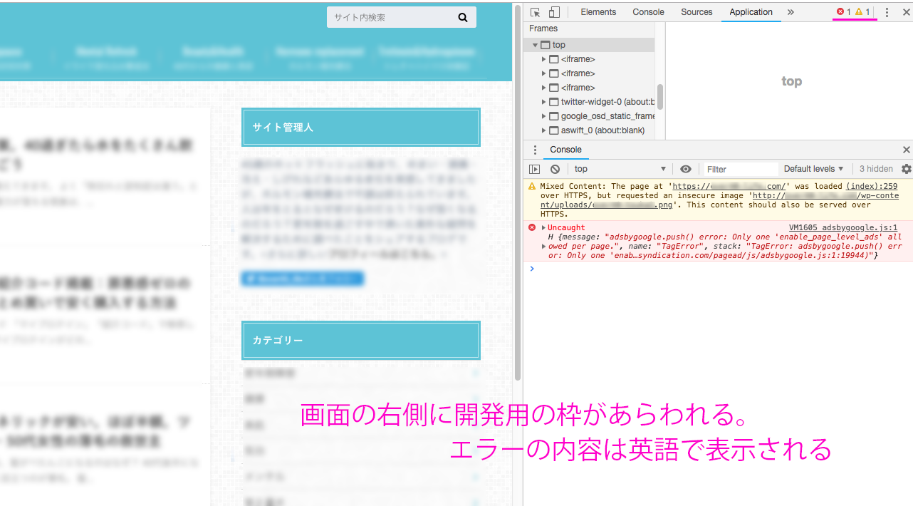 右上にエラーアイコン(×とか!とか)が並んでいるので、それをクリックすると、その詳細が下に書かれています。