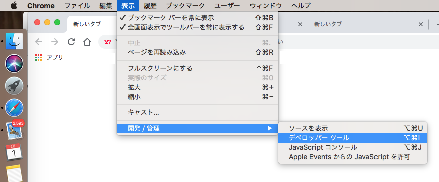 メニューバー → 表示 → 開発/管理 → デベロッパーツール と進むと