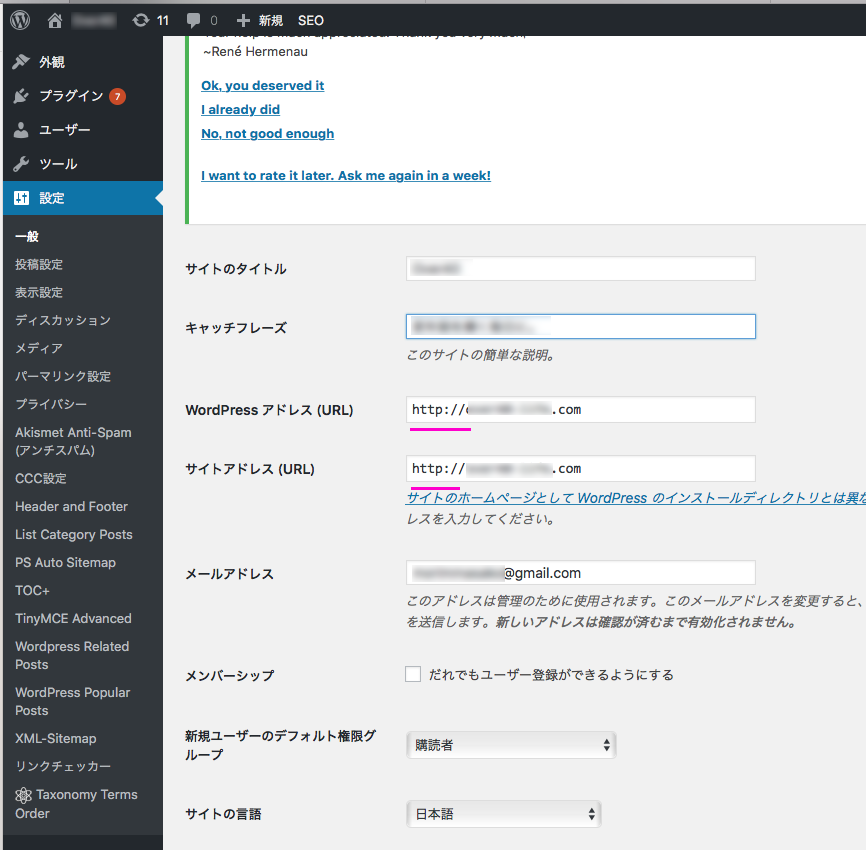 WordPressアドレス・サイトアドレスを設定から確認してみると、SSL化したあとここはほったらかしでした。